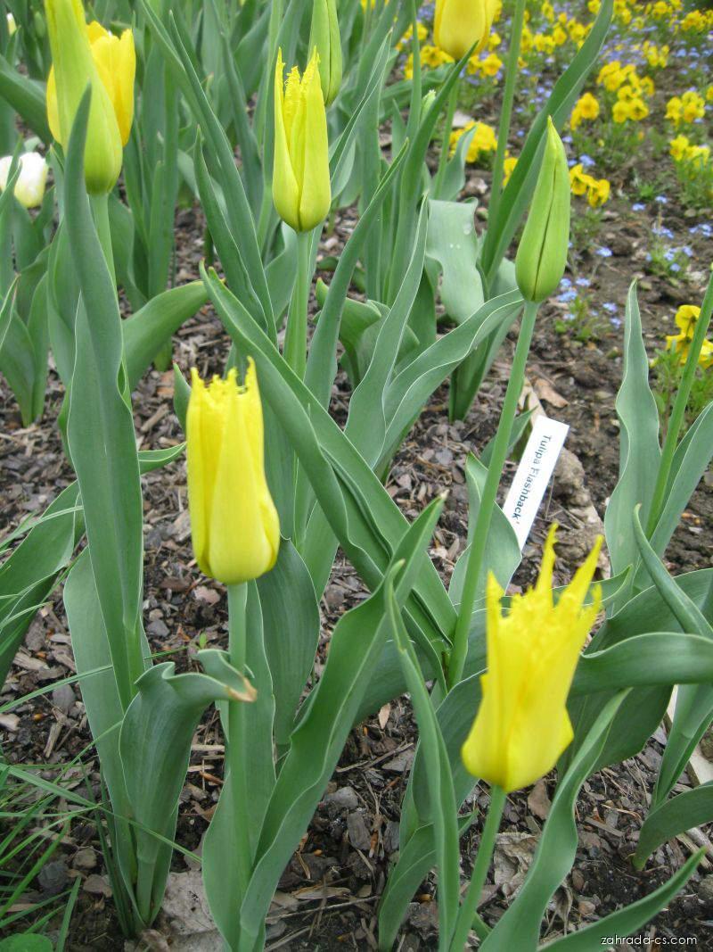 Ing. Miloš Krump: Barva květů: žlutá, Doba kvetení: květen, Tulipán Flashback má zlatě žluté, úzce tvarověné květy. Místo: Dendrologická zahrada Průhonice
