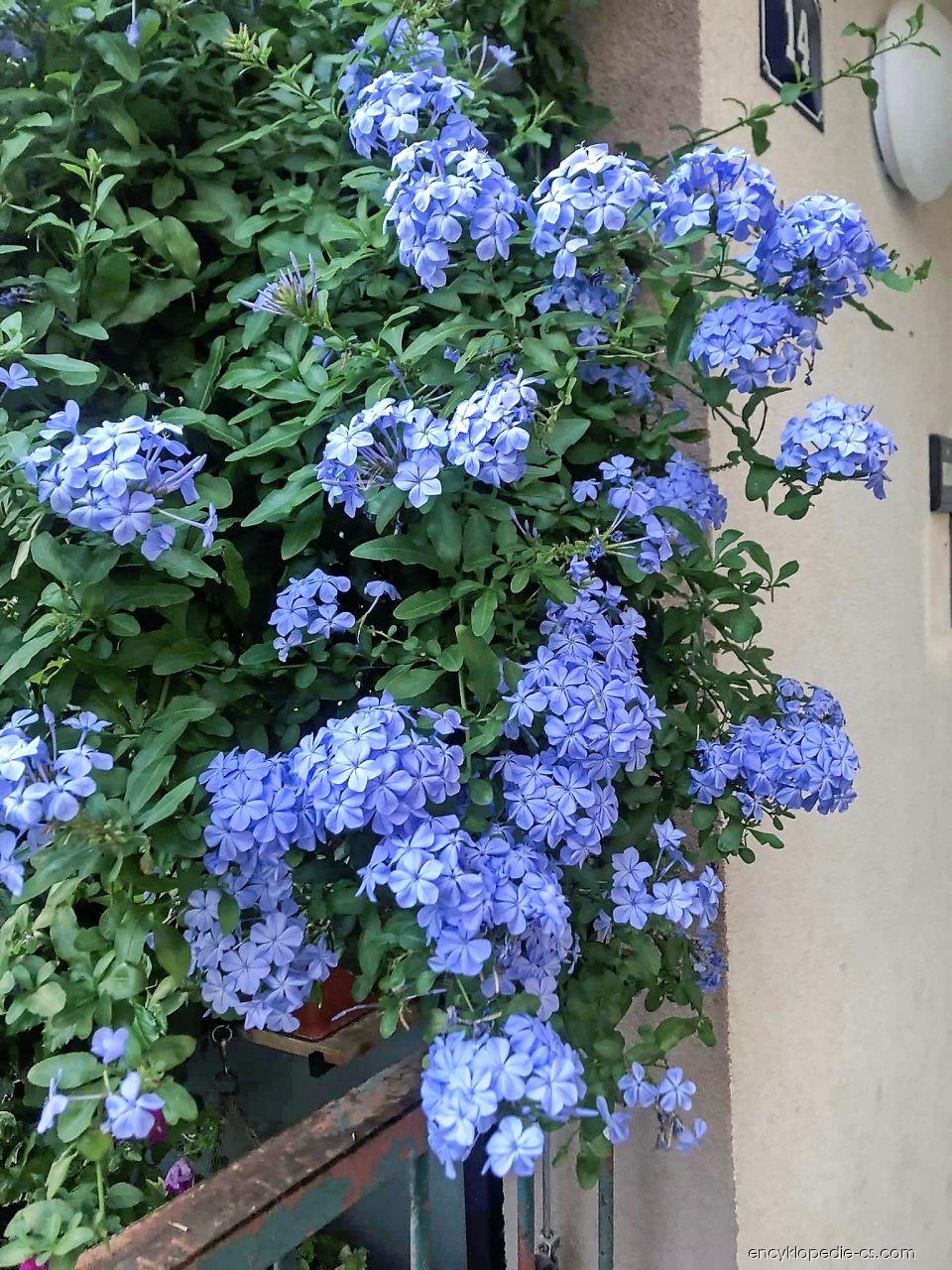 Olověnec ouškatý je asi 3 až 6 m vysoký stálezelený keř z čeledi Plumbaginaceae, který má tenké a pružné výhony. Listy jsou protáhlého až protáhle kopisťovitého tvaru a mají tmavě zelenou barvu. Květy vytvářejí hustě chocholičnaté hrozny modré nebo bílé barvy, jež vykvétají od konce léta do podzimu. Plumbago auriculata pochází z jižní Evropy.